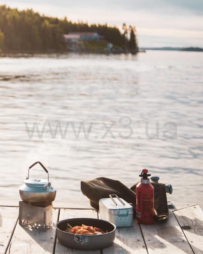 Внутрь помещается любая горелка Trangia (спиртовая, газовая, мультитопливная или гелевая), что позволяет компактно складывать снаряжение в рюкзак.