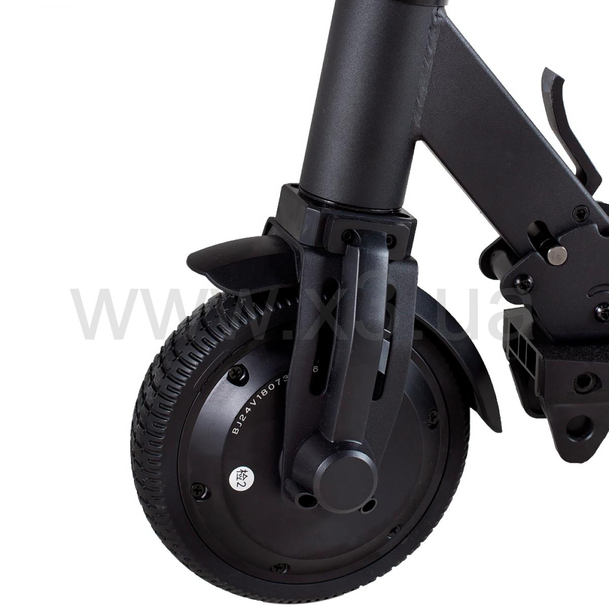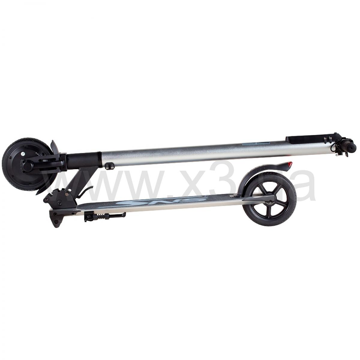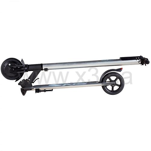 Обе части соединяет складной механизм, который приводит их в одну плоскость. Для того чтобы разложить самокат, необходимо нажать на небольшой рычаг, расположенный на складном механизме, и потянуть его чуть вверх и вправо, это можно сделать буквально одной рукой. Самокат принимает исходное положение за считанные секунды. Самокат весит 8,8 кг, конструкция выполнена из прочного алюминия, выдерживающего вес пилота до 120 кг. 250-ваттный мотор расположен в переднем колесе модели. Эта мощность позволяет развивать скорость до 25 км/час. Диаметр обоих колес - 6,5 дюймов, они выполнены из полиуретана. Заряжается самокат от бытовой розетки. Разъем для зарядного устройства расположен вверху рулевой стойки, он закрывается резиновой заглушкой. Внутри установлен надежный литиевый аккумулятор. Стандартное время зарядки - 3-4 часа, дальность поездки с полным ресурсом может составить до 15 км.