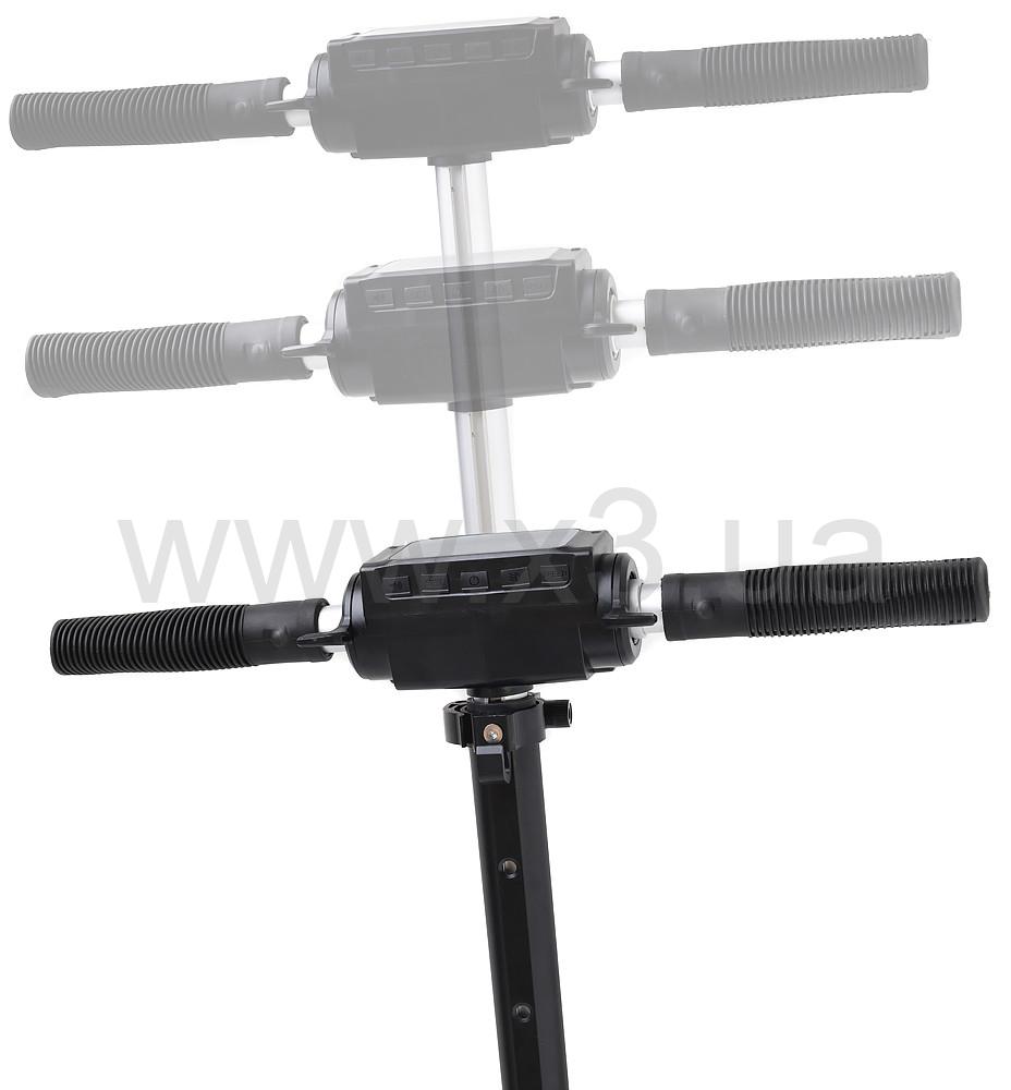 Электросамокат состоит из: Рулевой стойки, к которой подведено переднее колесо, оснащенное мотором мощностью в 350 W. Рулевая стойка регулируется по росту.