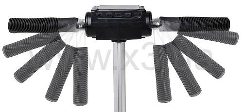 Самокат имеет складной механизм. Сложить и разложить его можно за секунды. За сложение отвечает рычаг, находящийся на передней части стойки. При нажатии на него, крепление руля и рамы расслабляется, руль опускается к основанию и прикрепляется крючком к крылу.