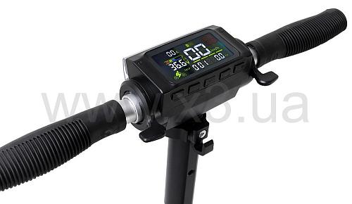 На рулевой стойке расположен бортовой компьютер, который показывает: заряд батареи, километраж и скорость движения. Изображение на дисплеи очень четкое и яркое, разглядеть параметры поездки можно будет, как днем, так и ночью. Максимально возможная скорость 30 км/ч - для самоката это очень внушительная цифра.