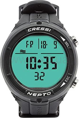 Благодаря диаметру корпуса всего 48 мм и высококонтрастному дисплею 35 мм Nepto представляет собой чрезвычайно компактный часовой компьютер, специально предназначенный для фридайвинга. Этот инновационный продукт может похвастаться разработанным в Cressi алгоритмом, который защищает фридайвера от риска тараваны, и функция, предотвращающая риск отека легких. Минеральное стекло, прочный корпус со стальными кнопками для устойчивости к давлению воды до 120 м, резиновый ремешок с пряжкой из нержавеющей стали