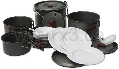 Набор посуды из анодированного алюминия. Лёгкий, огне- и жаростойкий. Легко чистится. Складные ручки с противоскользящим покрытием. Сетчатый транспортировочный чехол.