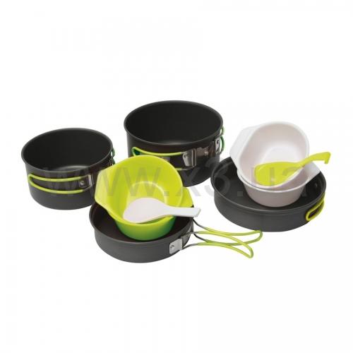 В комплект входят две кастрюли, две сковороды (крышки), две ложки и четыре тарелки.Набор предназначен для 3-5 человек. Поверхностный слой анодирован, что придает изделиям огнестойкость, износостойкость. Сковородки могут быть использованы как крышки для кастрюль.