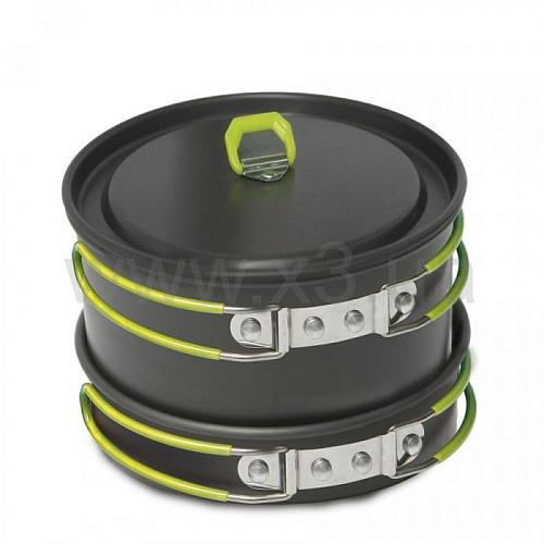 Набор алюминиевой посуды для большой дружной семьи из 3-5 человек. Поверхностный слой анодирован, что придает изделиям огнестойкость, износостойкость. В комплект входят 2 кастрюли, cковородка, 2 крышки для кастрюль. Набор компактно складывается по принципу матрешки.