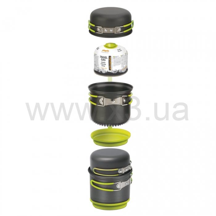Набор алюминиевой посуды Pinguin Solo X 622003 с теплообменным элементом из закаленного алюминия на одного человека. Поверхностный слой анодирован, что придает изделию огнестойкость и износостойкость.