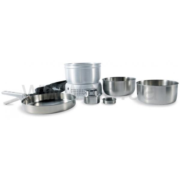 Посуда для кемпинга изготовлена из нержавеющей стали 18/8 и состоит из сковороды, двух кастрюль, зажима для кастрюли, решетки для готовки и спиртовой горелки. Время горения около 40 минут на одну заправку.