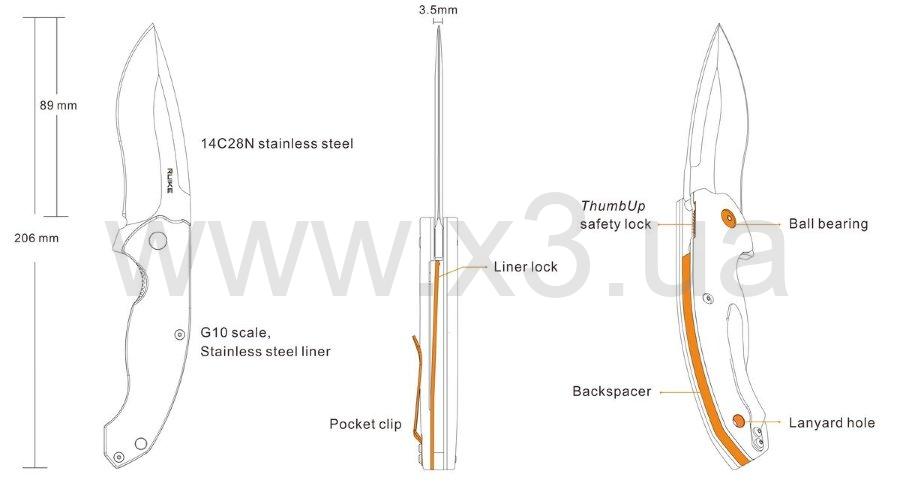 Складной нож Ruike P852-B отлично подходит для выполнения всех вышеописанных задач. Его прочный клинок, изготовленный из нержавеющей стали марки 14C28N, прекрасно выдерживает интенсивные механические нагрузки, температурные перепады и воздействие влаги. А за счёт его оригинальной формы, массивности и гладкой заточки режущей кромки, нож Ruike P852-B можно использовать для режущих, колющих и рубящих действий.