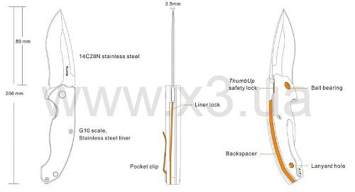 за фиксацию клинка в открытом виде отвечает замок Liner-lock, дополненный механизмом ThumbUp safety lock;