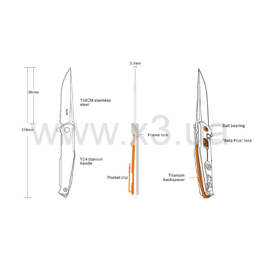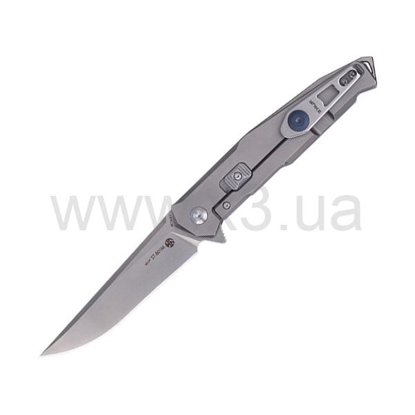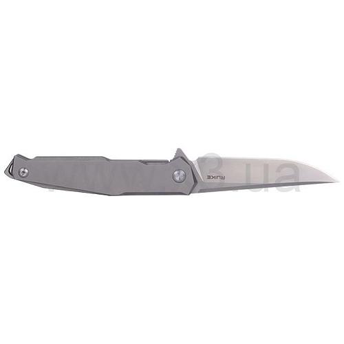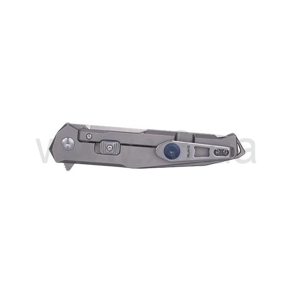 Рукоять инструмента сделана с использованием материала TC4. Это титановая рукоять, у которой практически нет выступающих элементов либо насечек. Фиксирующий замок Frame lock обладает предохранительной системой Beta Plus и съемным наконечником. Он препятствует истиранию, деформации и заеданию от контакта двух металлов. Односторонняя съемная клипса ножика имеет пластинчатую конструкцию. Также она оснащена стопором контрастного цвета, за счет которого исключается риск случайного соскальзывания. Материалом проставки рукоятки является титан. Проставка выступает за рукоятку сквозным отверстием для всевозможных шнурков, карабинов и веревок.