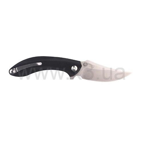 Лезвие представленой модели выполнено в форме Clip-point с немного завышенным кончиком по отношению к линии обуха и достаточно «выгнутой» гладкой режущей кромкой, благодаря чему нож прекрасно справляется с резом самых разнообразных материалов.