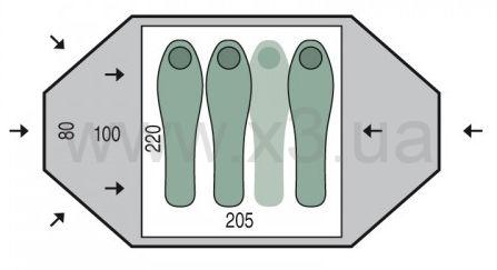 Инновационная модель с двумя входами и тамбурами, двумя поперечными дугами. Достаточно высокие тамбуры и жесткость конструкции позволяют использовать палатку в сложных условиях.