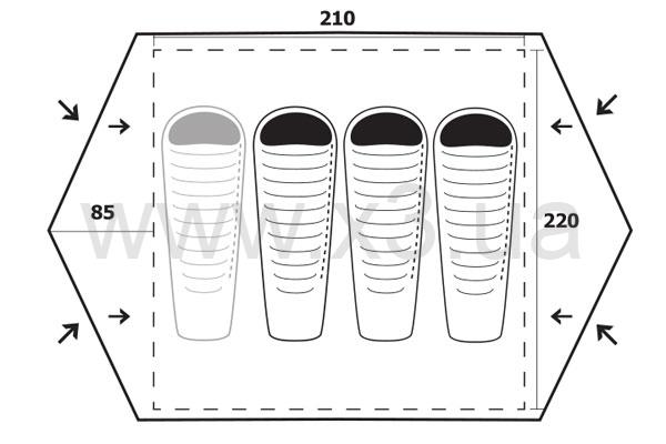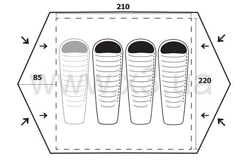 Палатка для 3-4 человек. Два входа с тамбуром обеспечивают пользователям комфорт. Палатка также пригодна для использования в требовательных условиях высокогорного туризма. Трёхстержневая конструкция устойчива даже при сильных порывах ветра. Тамбуры очень просторны для багажа или приготовления пищи.