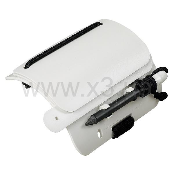 Слейт наручный 3-х страничный Dive Rite представляет собой три пластиковых пластины белого цвета, скреплённых между собой резиновым кордом. При перелистывании страницы она оказывается зафиксированной наверху обратной стороной к дайверу, так что для записей можно полностью использовать обе стороны каждой из пластин. Слейт имеет изогнутую форму, которая соответствует изгибу руки. Крепится на руку стропой с липучкой и/или двумя эластичными кордами, весь крепёж имеется в комплекте. Монолитный карбоновый карандаш также закреплён на резиновом жгуте.