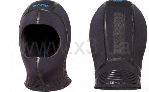 Шлем выполнен из 7 мм неопрена лицевой обтюратор толщиной 5 мм. Шлем разработан так чтобы работать с шейной манжетой сухого костюма, предотврашая попадания воду внутрь. Очень эластичный неопрен.