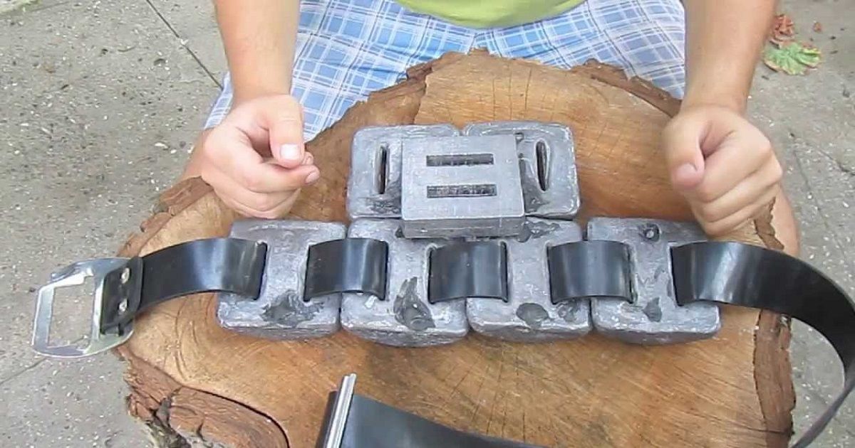 Для таких поясов используются обычные свинцовые грузы. Во избежание скольжения и непроизвольного перемещения грузов по ленте ремня часто используются пластиковые фиксаторы или груз со встроенным фиксатором.