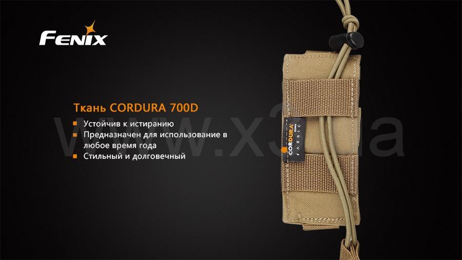 Чехол изготовлен из прочного на разрыв и чрезвычайно износостойкого материала под названием Cordura, так что способен прослужить много лет. Размер внутреннего пространства чехла легко регулировать за счет липучки на внутреннем кармане. Внутри Fenix-TT-Holster-E отлично разместятся различные фонари Fenix: