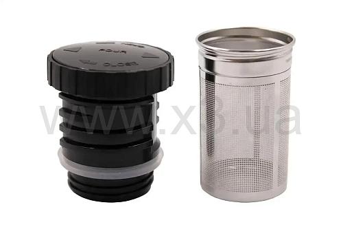Пробка с щелевым типом налива к нижней части которой прикручивается цилиндрическое металлическое ситечко для заварки (чай или кофе).
