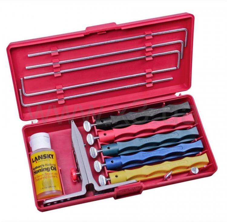 Каждый кейс Lansky Sharpening System включает запатентованный зажим для ножа со сменным углом затачивания, точильные камни с рукоятками, цвет которых обозначает зернистость камня, направляющие для каждого точильного камня и специальное масло для камней, позволяющее улучшить результаты затачивания.