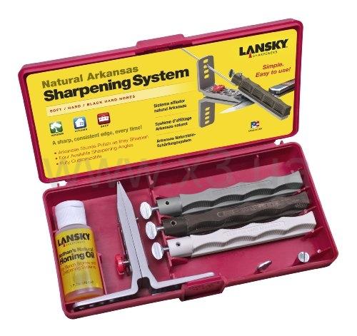 Каждый кейс Lansky Sharpening System включает запатентованный зажим для ножа со сменным углом затачивания, точильные камни с рукоятками, цвет которых обозначает зернистость камня, направляющие для каждого точильного камня и специальное масло для камней, позволяющее улучшить результаты затачивания.