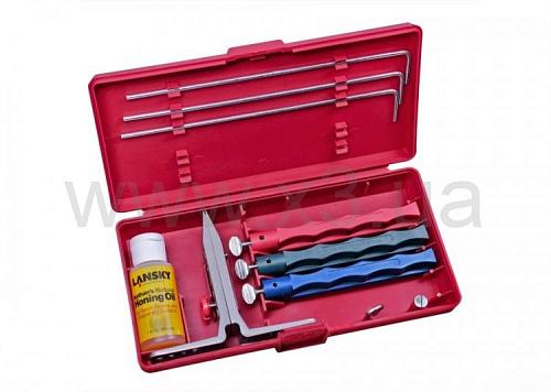 Каждый кейс Lansky Sharpening System включает запатентованный зажим для ножа со сменным углом затачивания, точильные камни с рукоятками, цвет которых обозначает зернистость камня, направляющие для каждого точильного камня и специальное масло для камней, позволяющее улучшить результаты затачивания.