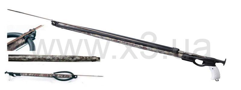 Ружье с несущей аллюминиевой трубой сложного профиля, изготовленной по технологии "гидроформинга", что придает ружью исключительную жесткость, легкость и маневренность. Рукоятка CAYMAN с цельным шепталом из нержавеющей стали и точкой упора совпадающей с центром несущей трубы. Оголовник рассчитан на две кольцевые тяги и имеет съемную перемычку из нержавеющей стали, что позволяет использовать гарпуны с зацепом типа "акулий плавник". Анатомическая рукоятка с отличным запасом под палец идеально ложится в руку. Окрашено в камуфляжную 3D расцветку. Белая рукоятка для лучшей видимости в воде. Поставляется с одной кольцевой тягой диаметром 18 мм и гарпуном с нержавеющей стали диаметром 6,5 мм.
