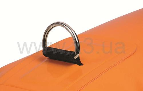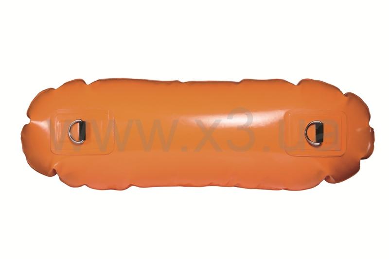 Рабочее давление камеры – 2 атмосферы. Клапан со стандартным автомобильным ниппелем позволяет накачивать буй от ручного насоса или электрического компрессора. Буй имеет объем 35 литров и оснащен двумя D-кольцами из нержавеющей стали для крепления линя. Эти кольца расположены на нижней стороне, чтобы буй оставался в нужном положении даже при сильном ветре. Кроме того, это препятствует, насколько это возможно, погружению буя во время рывков рыбы и заставляет ее двигаться в горизонтальном направлении, а не уходить вертикально вниз.