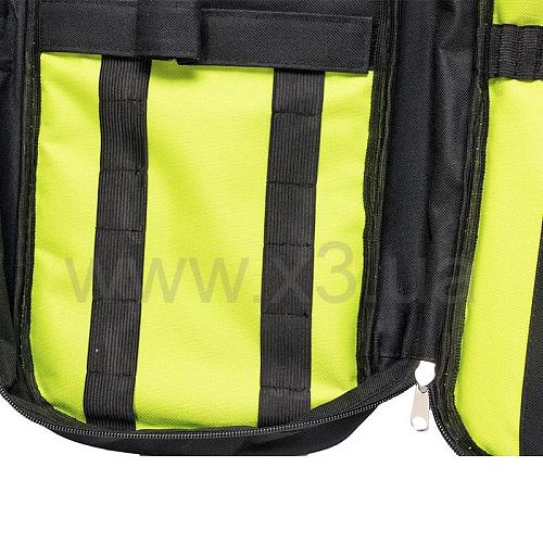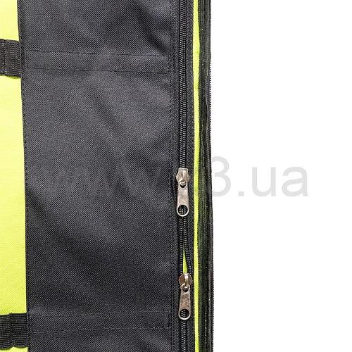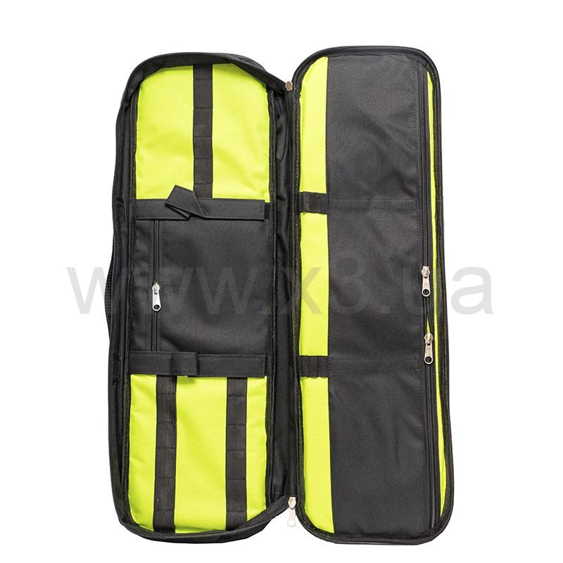 На лицевой стороне есть карман на молнии для необходимых мелких аксессуаров. Одна из внутренних стенок имеет крепежи для ружья в виде двух строп-липучек, они способны закрепить полностью снаряженное ружьё с физической длиной до 80 см - с подствольным фонарем и катушкой. Также на этой стороне расположены карман и резинки для необходимых аксессуаров: наконечников, заряжалки, фонаря. На противоположной стороне, под молнией, расположен универсальный карман с регулируемой длиной. На этой же стороне имеются резинки для фиксации гарпунов.