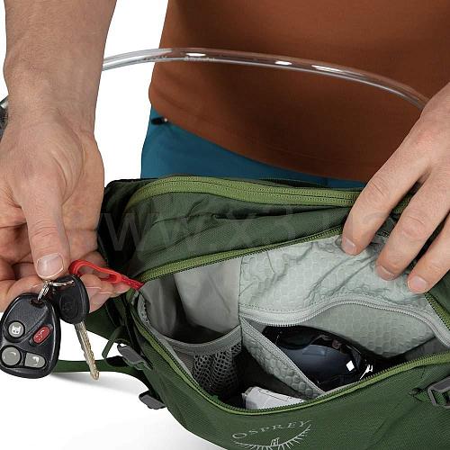 Удобная поясная сумка на 7 л от бренда Osprey - обновленная модель 2021 года. Отличный выбор для велосипедистов, сумка оснащена внутренним отделом для питьевой системы (1,5 л). На поясе есть магнит для закрепления трубки от питьевой системы. Спинка AirScape обеспечивает комфорт и воздухопроницаемость. Есть вместительный основной отдел, два боковых кармана на молниях и одна фронтальная, защищенный карман для очков или смартфона. На поясной сумке есть светоотражающие элементы для безопасного передвижения в темное время суток. Питьевая система идет в комплекте.