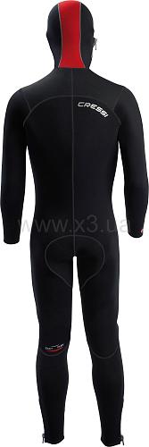 Полнокомплектный костюм из 7 мм двухслойного неопрена, со встроенным шлемом и передним креплением молнии, которое недавно было усовершенствовано как технически, так и эстетически.