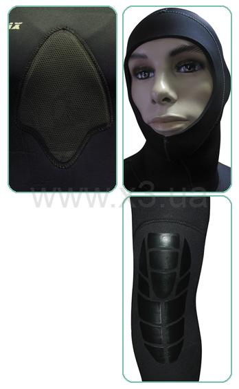 Пересечения швов снабжены полиуретановой защитой, повышающей износоустойчивость швов гидрокостюма.