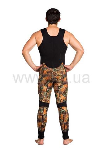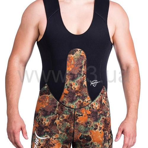 В брюках-комбинезоне в области майки применяется меньшая толщина неопрена (в моделях толщиной 7 и 9 мм), для облегчения дыхания охотника, в то же время, в районе солнечного сплетения добавлена специальная вставка из более толстого неопрена, для облегчения зарядки ружья.