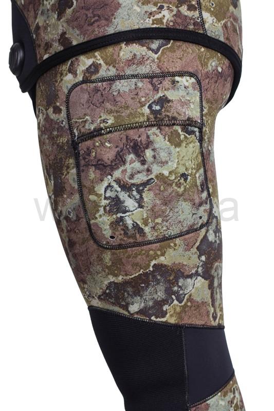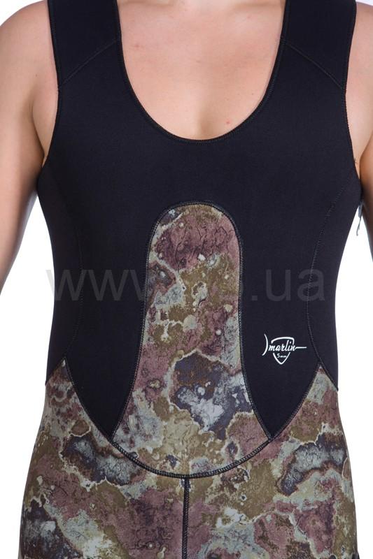 В брюках-комбинезоне в области майки применяется меньшая толщина неопрена (в моделях толщиной 7 и 9 мм), для облегчения дыхания охотника, в то же время, в районе солнечного сплетения добавлена специальная вставка из более толстого неопрена, для облегчения зарядки ружья.