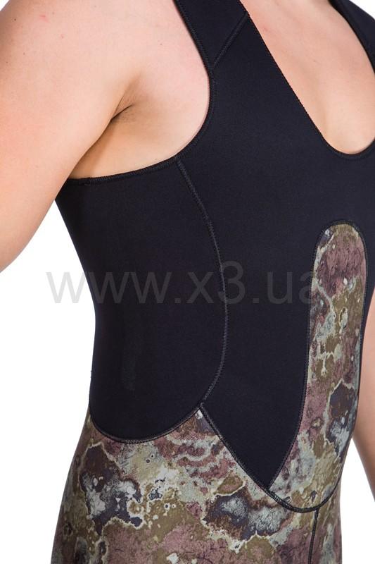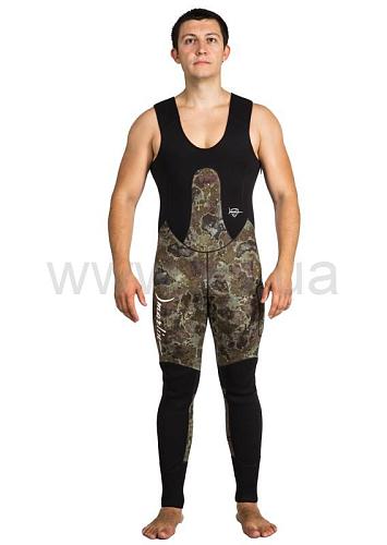 В брюках-комбинезоне в области майки применяется меньшая толщина неопрена (в моделях толщиной 7 и 9 мм), для облегчения дыхания охотника, в то же время, в районе солнечного сплетения добавлена специальная вставка из более толстого неопрена, для облегчения зарядки ружья.