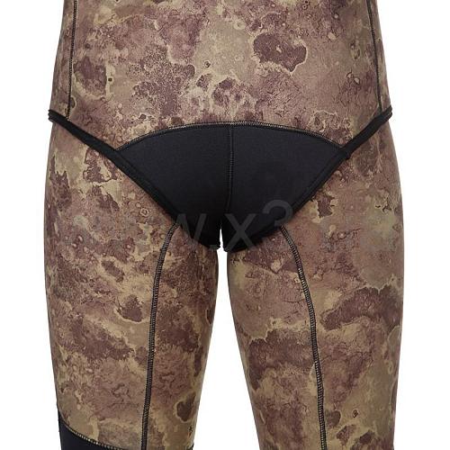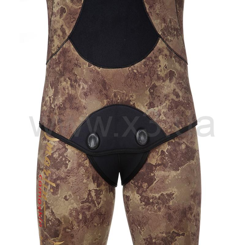 В брюках-комбинезоне в области майки применяется меньшая толщина неопрена (в моделях толщиной 7 и 9 мм), для облегчения дыхания охотника, в то же время, в районе солнечного сплетения добавлена специальная вставка из более толстого неопрена, для облегчения зарядки ружья.