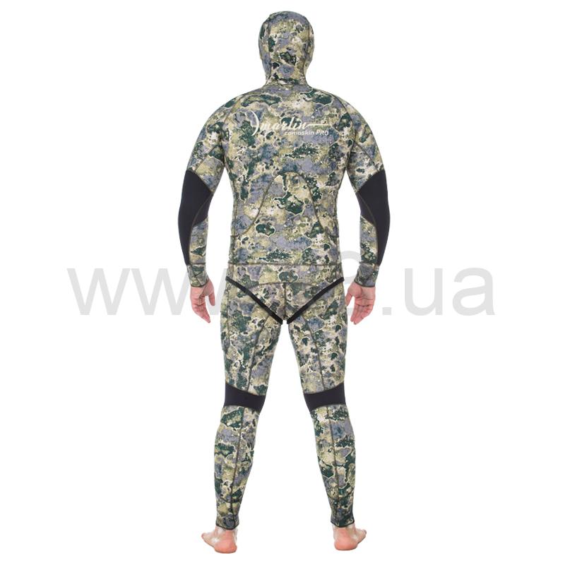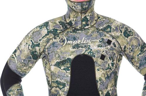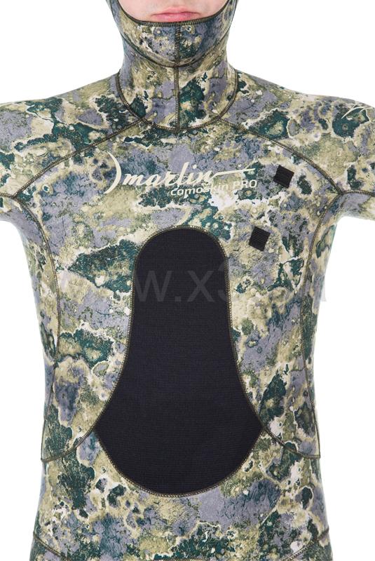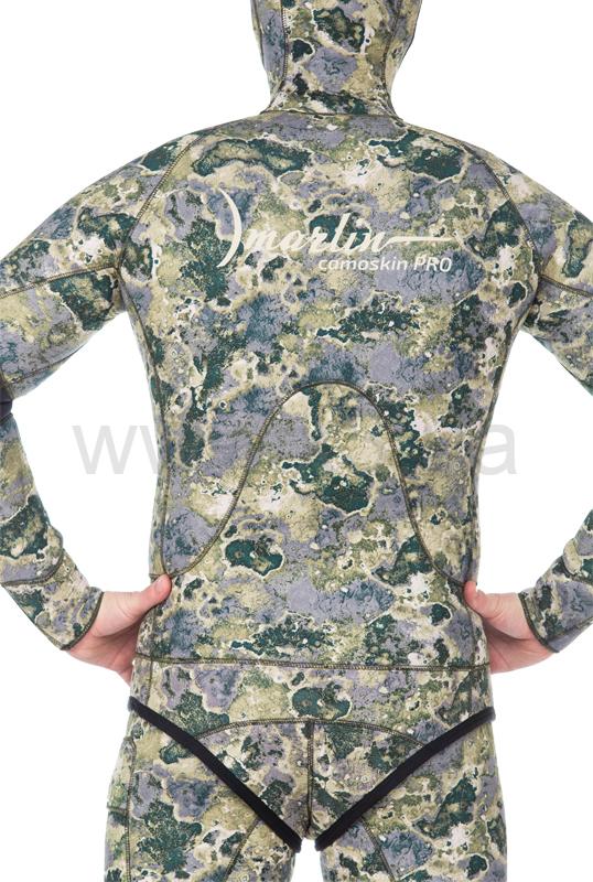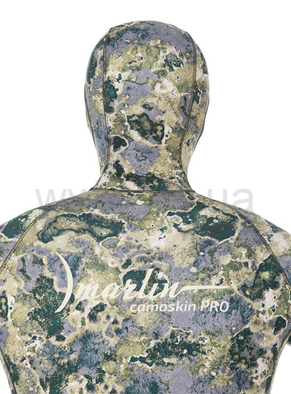 Гидрокостюм Marlin Camoskin Pro (Марлин Камоскин Про) – обновленная модель гидрокостюма Camoskin. При производстве данной модели используются различные виды неопрена и тканевые материалы ведущего мирового производителя - фирмы Шейко. Совершенный анатомический крой гидрокостюма состоит из 49 деталей, что делает его максимально удобным при длительной эксплуатации. Куртка имеет крой типа реглан, который увеличивает комфорт и создаёт максимальное прилегание гидрокостюма. Нагрудник (упор для зарядки ружей), вшитый в гидрокостюм, в отличие от приклеенных аналогов, исключает отрывание его в процессе эксплуатации. На шлеме, в районе ушей, имеются вставки из дублированного неопрена – для устранения присасывания шлема к ушам. В отличие от своего предшественника, костюм модели Camoskin Pro получил вставки камуфлированного окраса. Обтюраторы из материала smooth skin (смус скин) на ногах, руках и шлеме предотвращают попадание воды внутрь гидрокостюма и также имеют камуфлированный окрас.