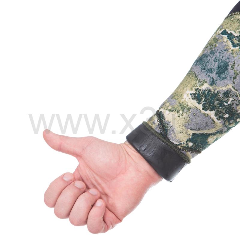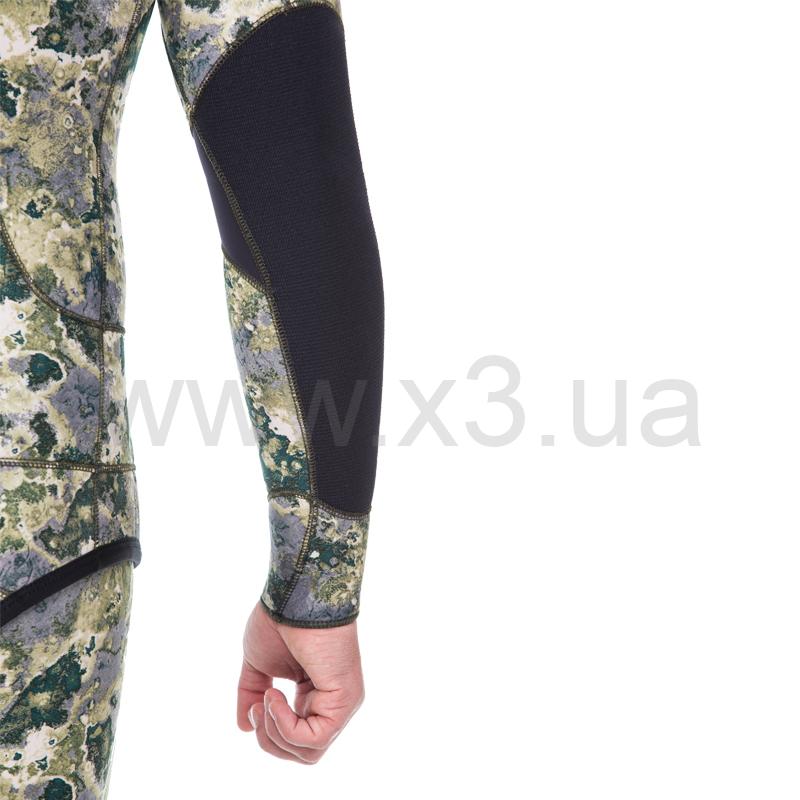 Материал duratex (дюратекс) защищает колени и локти костюма от преждевременного истирания. Вставки из сверхмягкого материала neospan в районе локтевых сгибов и под коленями существенно добавляют комфорта при эксплуатации. Нижняя часть куртки защищена дублированным нейлоном неопреном, который позволяет одевать и снимать куртку без опасения надорвать или оставить задир. В брюках-комбинезоне, в области майки, применяется меньшая толщина неопрена (в модели толщиной 7 мм) для облегчения дыхания охотника, в то же время в районе солнечного сплетения добавлена специальная вставка из более толстого неопрена для облегчения зарядки подводного ружья. Слева на бедре находится карман под клапаном, позволяющий положить в него ключи, телефон в гермопакете и многие другие ценные мелочи. Для самостоятельной подгонки длины гидрокостюма имеются специальные закрепки, расположенные на швах манжет куртки и брюк, а также на швах майки комбинезона. Гидрокостюм имеет «мягкие швы» благодаря проклейке специальным клеем. Поверхностные швы выполнены двухниточным плетением, цвет нитки подобран в тон камуфляжа. Все края костюма прооверложены, что исключает надрыв ткани и увеличивает срок его эксплуатации.