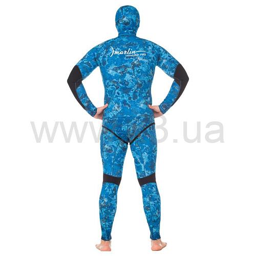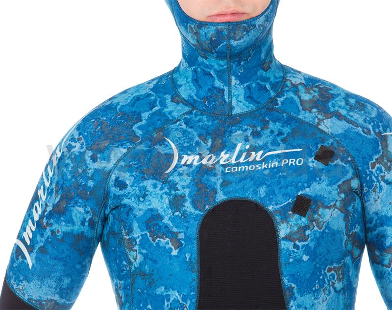 Гидрокостюм Marlin Camoskin Pro (Марлин Камоскин Про) – обновленная модель гидрокостюма Camoskin. При производстве данной модели используются различные виды неопрена и тканевые материалы ведущего мирового производителя - фирмы Шейко. Совершенный анатомический крой гидрокостюма состоит из 49 деталей, что делает его максимально удобным при длительной эксплуатации. Куртка имеет крой типа реглан, который увеличивает комфорт и создаёт максимальное прилегание гидрокостюма. Нагрудник (упор для зарядки ружей), вшитый в гидрокостюм, в отличие от приклеенных аналогов, исключает отрывание его в процессе эксплуатации. На шлеме, в районе ушей, имеются вставки из дублированного неопрена – для устранения присасывания шлема к ушам. В отличие от своего предшественника, костюм модели Camoskin Pro получил вставки камуфлированного окраса. Обтюраторы из материала smooth skin (смус скин) на ногах, руках и шлеме предотвращают попадание воды внутрь гидрокостюма и также имеют камуфлированный окрас.