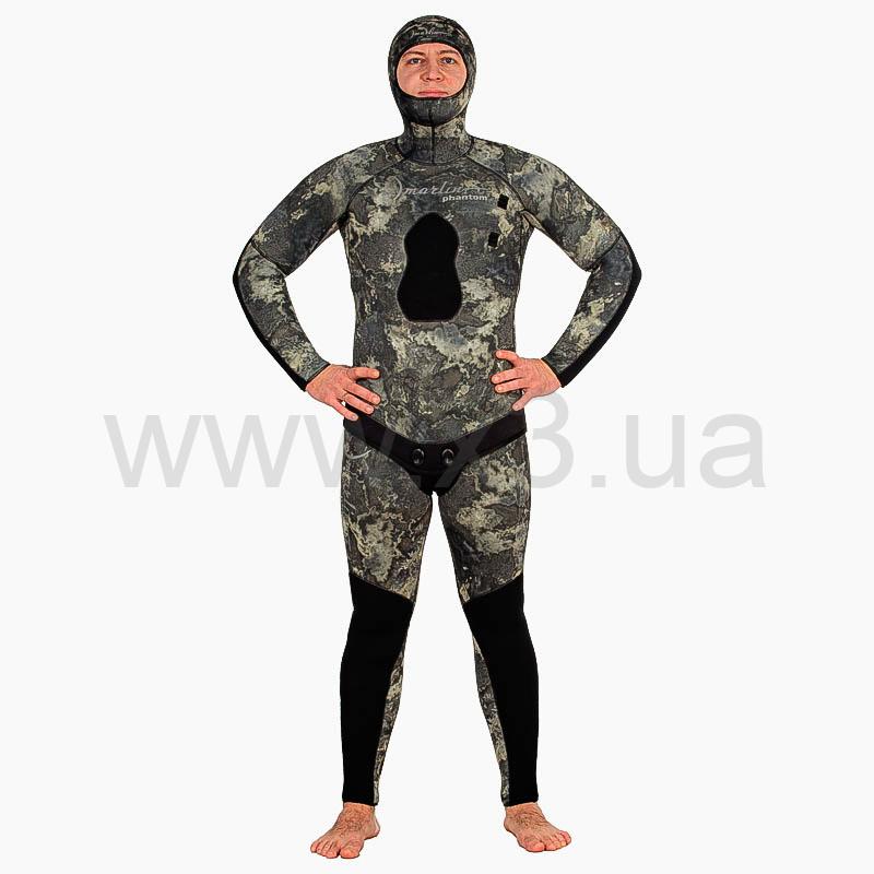 Гидрокостюм Marlin Phantom (Марлин Фантом) – гидрокостюм для подводной охоты, изготовленный из неопрена Nam Liong. Анатомический крой состоящий из 29 деталей обеспечивают комфорт при длительном использовании. Наружное покрытие – ультрастрейч, обладает повышенной эластичностью, внутренняя поверхность – открытая пора. Куртка имеет крой типа реглан, который увеличивает комфорт и создаёт максимальное прилегание гидрокостюма при эксплуатации. Для облегчения дыхания (на моделях 7, 9 и 10 мм) - майка комбинезона (Long John) выполнена из неопрена меньшей толщины. Материал duratex (дюратекс) защищает колени и локти костюма от преждевременного истирания.