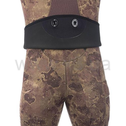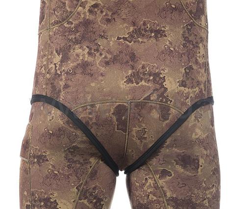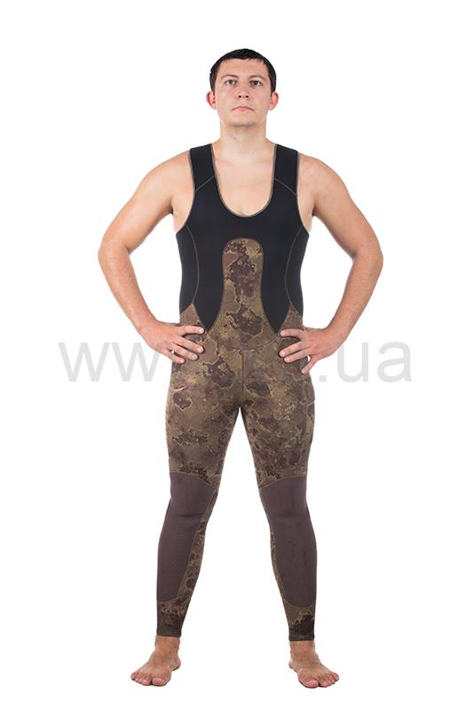 В брюках-комбинезоне (в области майки) применяется меньшая толщина неопрена (в моделях толщиной 7 и 9 мм) для облегчения дыхания охотника; в то же время в районе солнечного сплетения добавлена специальная вставка из более толстого неопрена для удобства зарядки подводного ружья.