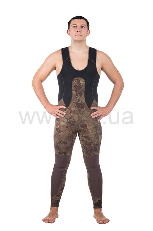 В брюках-комбинезоне (в области майки) применяется меньшая толщина неопрена (в моделях толщиной 7 и 9 мм) для облегчения дыхания охотника; в то же время в районе солнечного сплетения добавлена специальная вставка из более толстого неопрена для удобства зарядки подводного ружья.