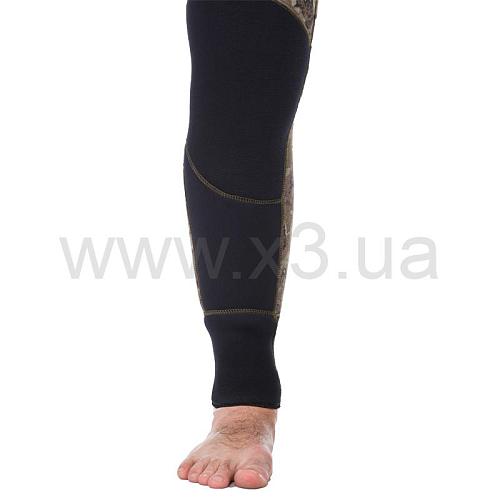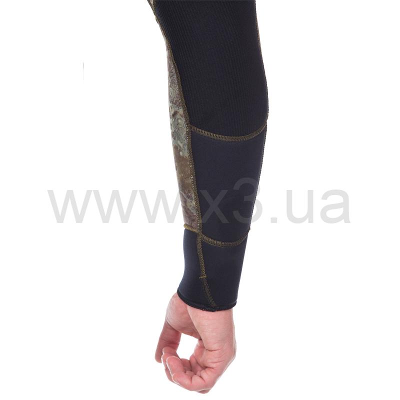 Справа на груди имеется крепление для ножа в виде строп пришитых по специальной технологии, которая не позволяет воде проникнуть сквозь шов в костюм. Для надежного крепления ножен разной длины каждый отрезок стропы имеет по три ячейки. Ножны можно закрепить с помощью пластиковых стяжек.