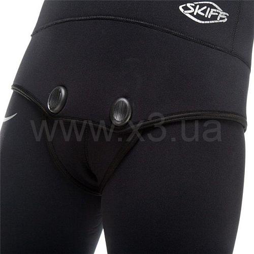 Нагрудник вшит в гидрокостюм по специальной технологии, благодаря которой он не будет отрываться в процессе эксплуатации. Колени и локти костюма усилены прочным к истиранию материалом duratex. Нижняя часть куртки выполнена из двудублированого неопрена (нейлон\нейлон), чтобы исключить возможность повреждения костюма в процессе одевания и снятия, увеличить срок эксплуатации изделия.