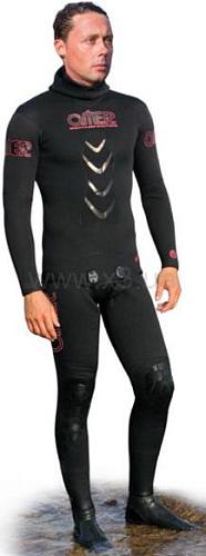 Колени усилены особым покрытием хорошо защищающим эти участки костюма от износа не ухудшая при том подвижность коленных суставов. Предназначен для охоты в не очень прохладной воде.
