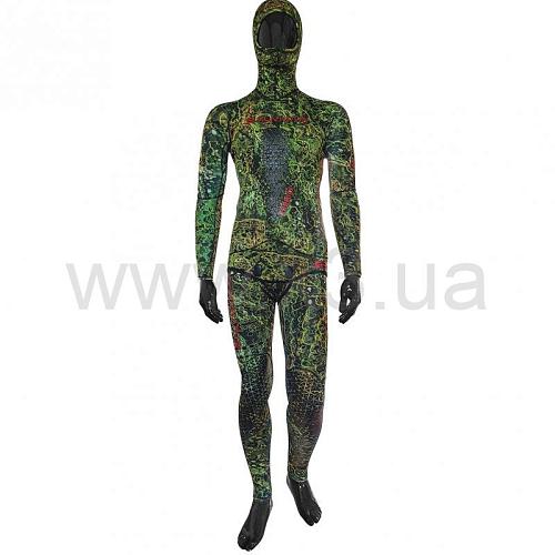 Salvimar Kromick - гидрокостюм толщиной 5,5 мм изготавливаются из новых высокоэластичных и крепких неопреновых материалов. Включает в себя куртку оснащенную капюшоном и короткие штаны по уровень солнечного сплетения. С наружней стороны ультра-эластичный спандекс Camo, что защищает его он различных механических воздействий. Имеет оригинальную камуфляжную раскраску. Оснащен усилениями колен и груди. Выполнен в анатомическом крое и двойным поперечным швом GBS для максимальной прочности и герметичности.
