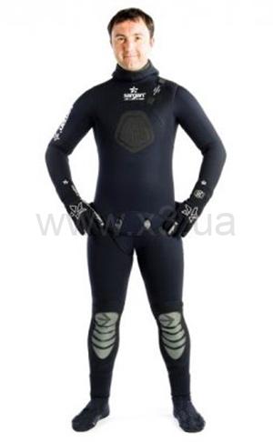 Гидрокостюм мокрого типа, сшит из неопрена МRSP-11Y18E (Тайвань) повышенной плотности с увеличенным сроком службы 3-7 лет, толщиной 9 мм. Все швы гидрокостюма не сквозные, прочно и качественно склеенные. На груди присутствует упор для удобного заряжания ружья.