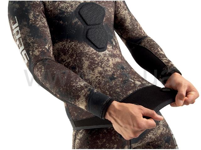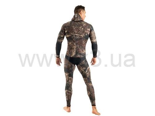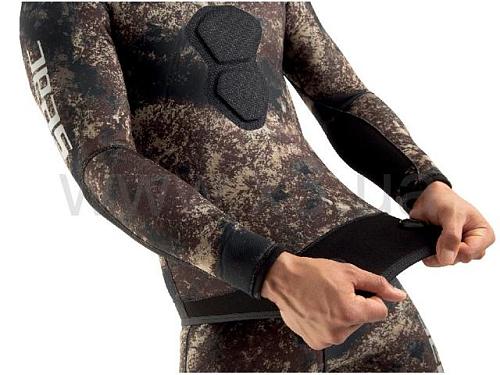Сверхэластичный костюм-двойка из камуфляжного неопрена. Эксклюзивная камуфляжная ткань SEAC® в темно-коричневых, зеленых и оранжевых тонах.