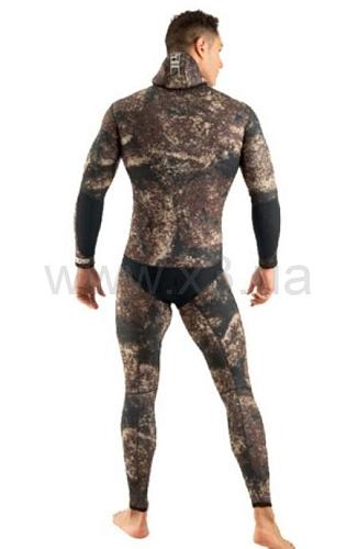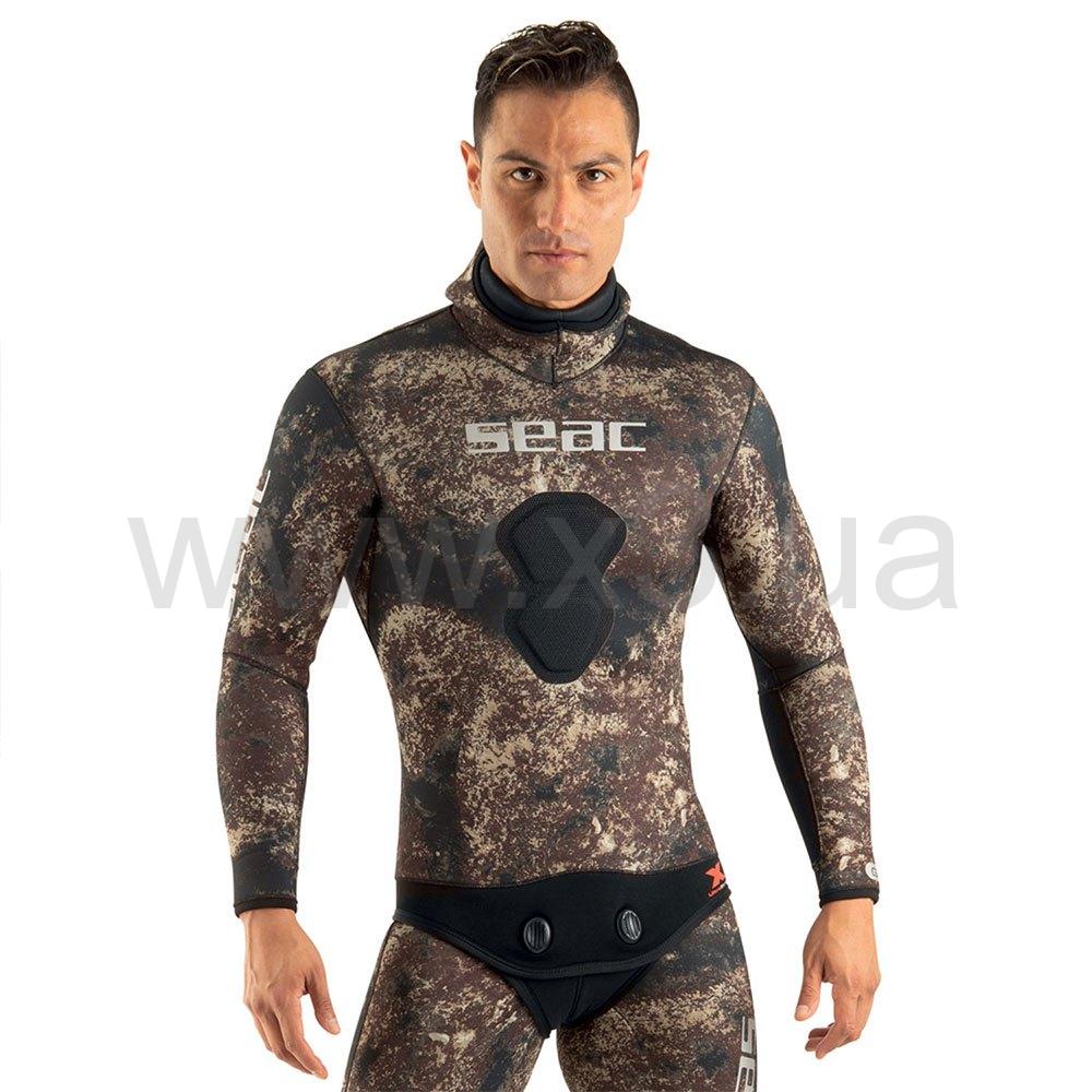 Камуфляжный гидрокостюм из двух частей из сверхэластичного неопрена. Эксклюзивный камуфляжный материал Seac® темно-коричневого цвета. Костюм проклеен и прошит плоской сурьетой. Текстиль с покрытием снаружи, разрез внутри. Анатомически профилированный вырез на руках/коленах/спине и отделка Aquastop вокруг лица, запястий и лодыжек с системой SSRS (Super Stretch Seal System). Куртка толщиной 7 мм со встроенной крышкой, защитой предплечья Powertex от царапин, застежкой «бобровый хвост» с двумя пластиковыми проушинами и лицевой пластиной для загрузки Melco Tape. Брюки с завышенной талией толщиной 7 мм с защитой от истирания Powertex на коленях. Эксклюзивный сверхэластичный камуфляжный материал Seac®