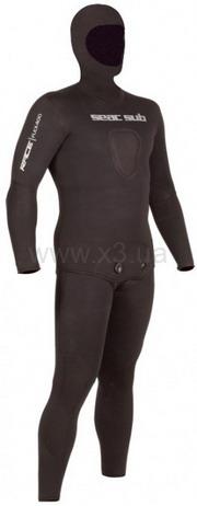 Анатомический крой, защита рук и ног. Все стыки материалов прошиты двойным швом. Костюм предназначен для охоты в холодной и очень холодной воде в течении длительного времени.
