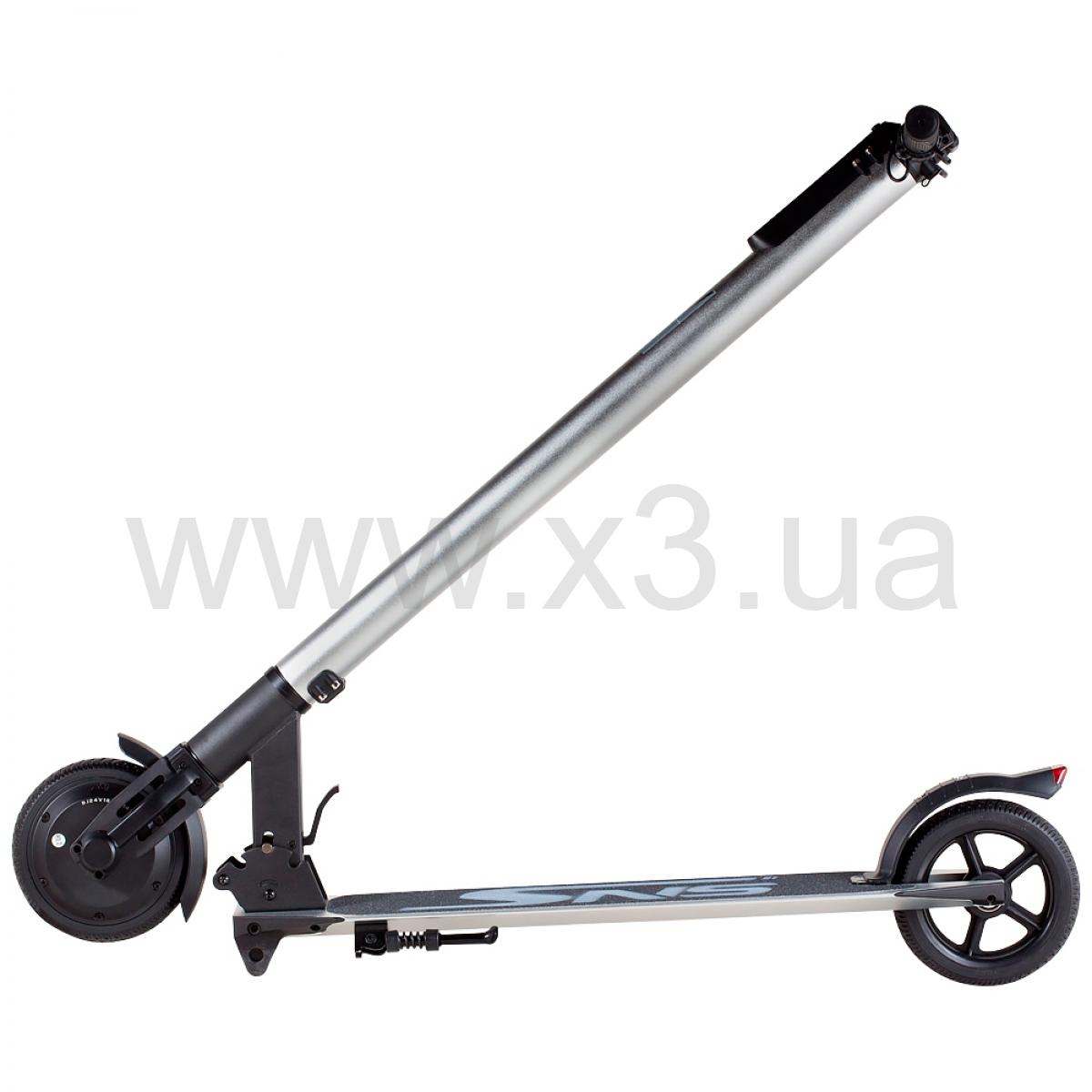 Обе части соединяет складной механизм, который приводит их в одну плоскость. Для того чтобы разложить самокат, необходимо нажать на небольшой рычаг, расположенный на складном механизме, и потянуть его чуть вверх и вправо, это можно сделать буквально одной рукой. Самокат принимает исходное положение за считанные секунды. Самокат весит 8,8 кг, конструкция выполнена из прочного алюминия, выдерживающего вес пилота до 120 кг. 250-ваттный мотор расположен в переднем колесе модели. Эта мощность позволяет развивать скорость до 25 км/час. Диаметр обоих колес - 6,5 дюймов, они выполнены из полиуретана. Заряжается самокат от бытовой розетки. Разъем для зарядного устройства расположен вверху рулевой стойки, он закрывается резиновой заглушкой. Внутри установлен надежный литиевый аккумулятор. Стандартное время зарядки - 3-4 часа, дальность поездки с полным ресурсом может составить до 15 км.